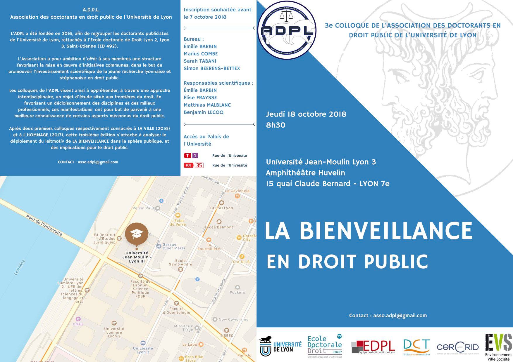 "La bienveillance en droit public" - 3e colloque de l'association des doctorants en droit public de l'Université de Lyon 18 octobre 2018 8h30 Amphithéâtre Huvelin, 15 quai Claude Bernard, Lyon Inscriptions à l'adresse suivante : asso.adpl[at]gmail.com Fichier(s) lié(s) Nom du fichier : Programme du colloque 1/2 Extension du fichier : jpg Poids du fichier : 230 Ko Nom du fichier : Programme du colloque 2/2 Extension du fichier : jpg Poids du fichier : 225 Ko